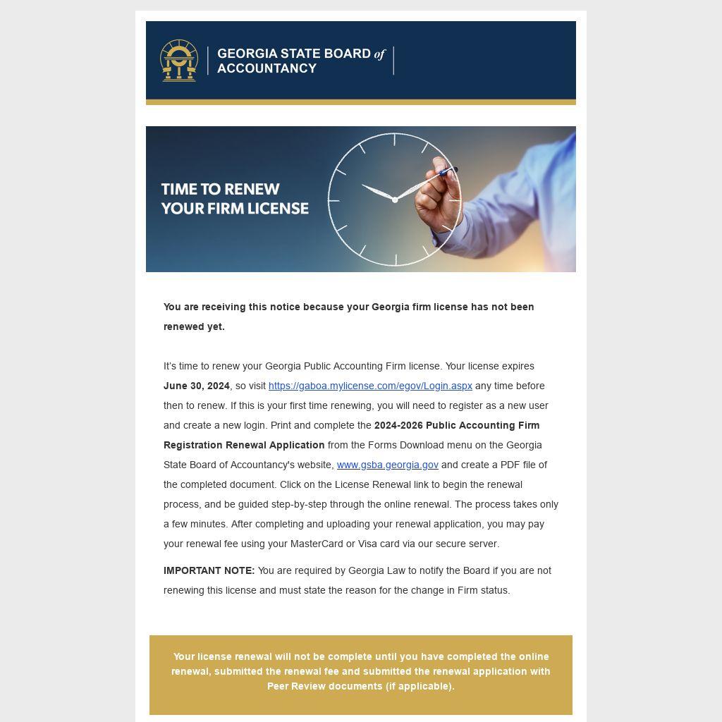 If you choose not to renew online and would like to submit a paper renewal application, please print the 2024-2026 Public Accounting Firm Registration Renewal Application from the Forms Download menu on the Georgia State Board of Accountancy's website, www.gsba.georgia.gov and submit to the Board office. Make sure to include your Firm license number on all correspondence to the Board office. Please note that renewing by mail may take up to four weeks to process after the completed renewal application is received. A statutory $250 late fee will be imposed if you renew after the license expiration date. You cannot practice after your license expiration date.