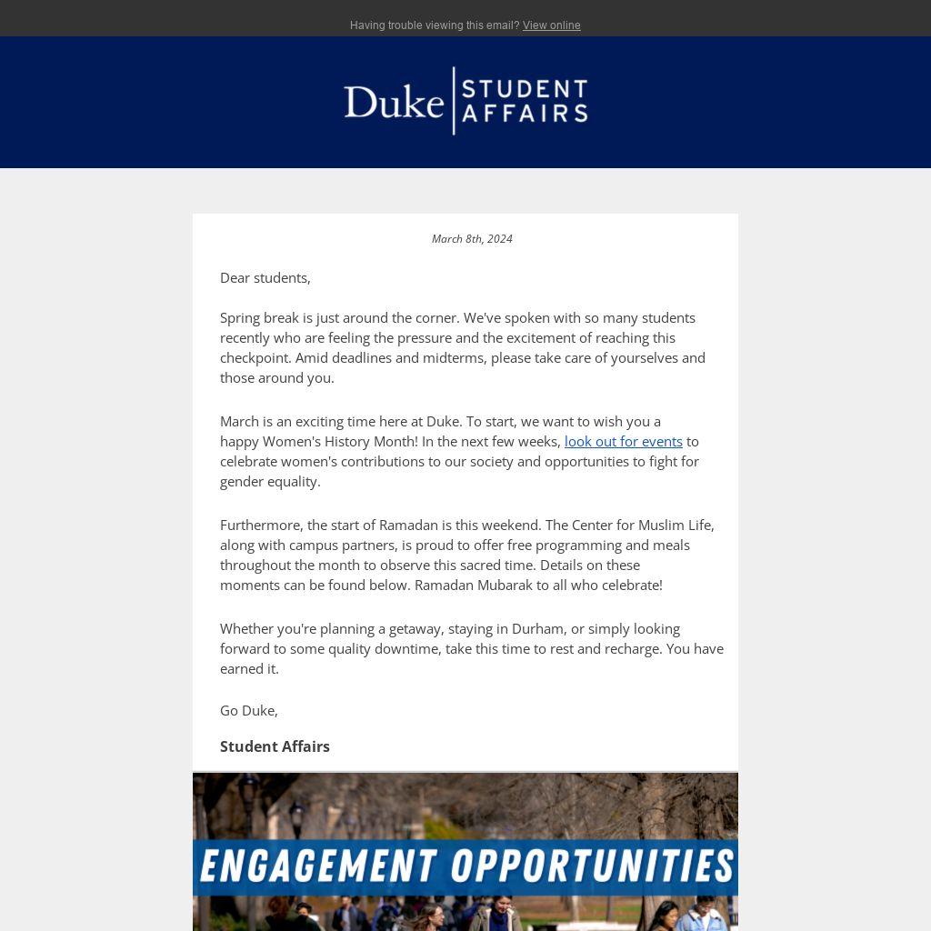 March is an exciting time here at Duke. To start, we want to wish you a happy Women's History Month! In the next few weeks, look out for events to celebrate women's contributions to our society and opportunities to fight for gender equality.