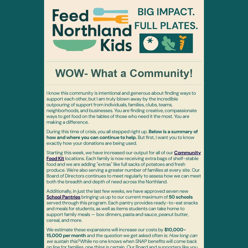We estimate these expansions will increase our costs by $10,000-15,000 per month and the question we get asked often is: How long can we sustain this? While no one knows when SNAP benefits will come back on line for families, one thing is certain. Our Board and supporters like you are determined to continue nourishing children and youth in the Northland for as long as it takes.