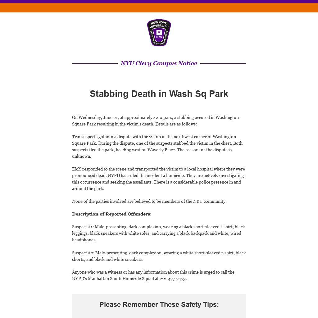 On Wednesday, June 21, at approximately 4:20 p.m., a stabbing occured in Washington Square Park resulting in the victim's death. Details are as follows: