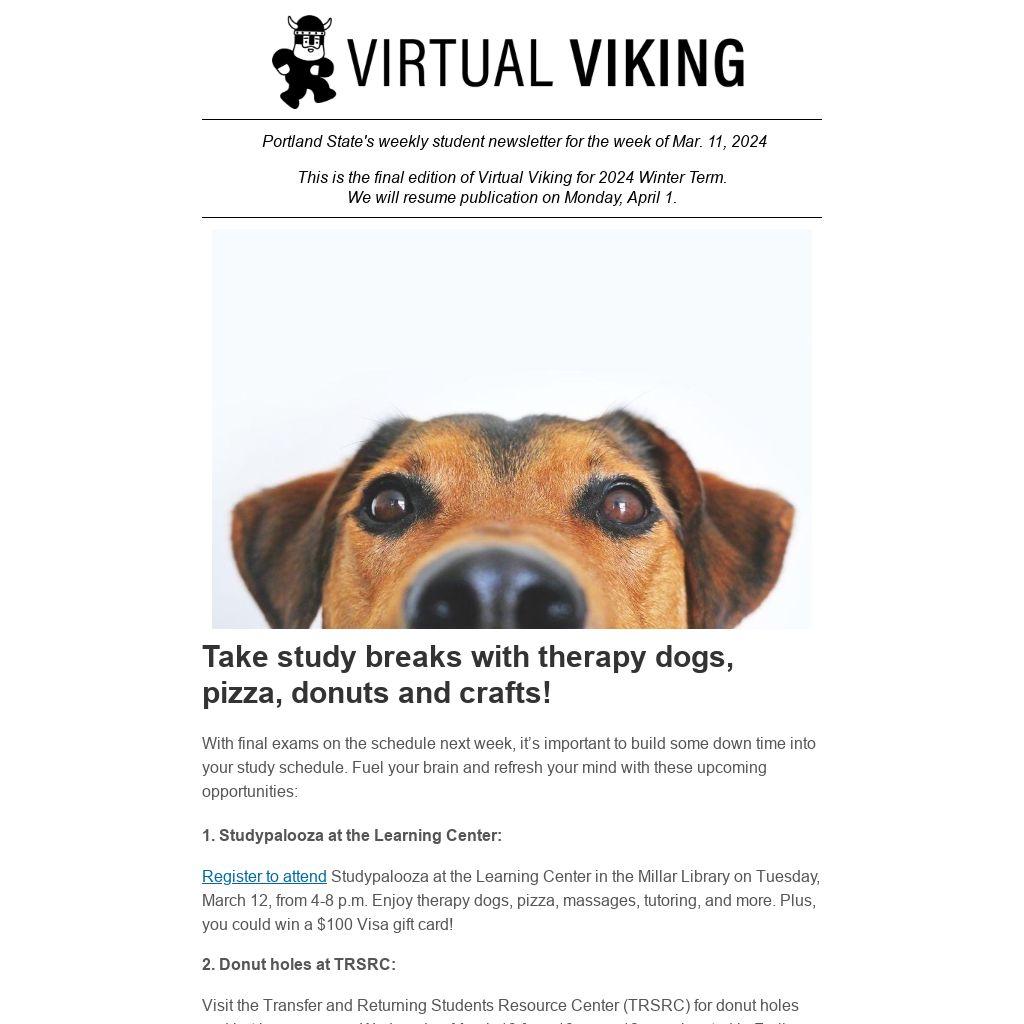 Virtual Viking is Portland State University's weekly student newsletter, published on Mondays by University Communications. To submit news or events, email virtualv@pdx.edu or visit pdx.edu/virtual-viking.