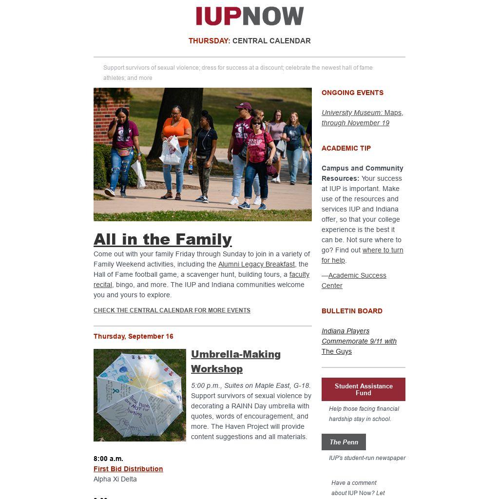 Distributed to IUP employees and students three days a week, IUP Now is the official newsletter of Indiana University of Pennsylvania. It features news from across the IUP website, compiled by the Division of Marketing and Communications. Find out how to get your news and events in IUP Now.