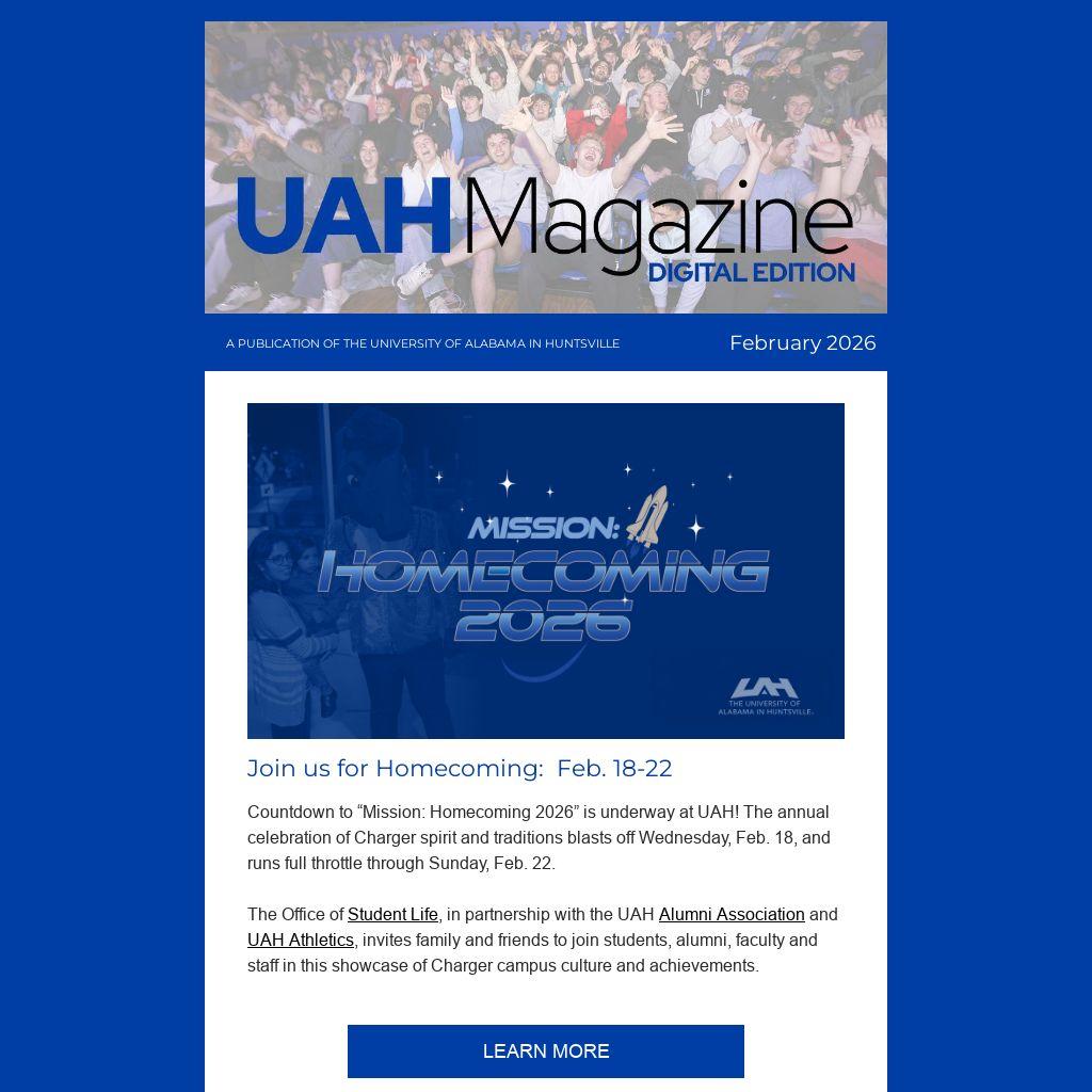 Countdown to “Mission: Homecoming 2026” is underway at UAH! The annual celebration of Charger spirit and traditions blasts off Wednesday, Feb. 18, and runs full throttle through Sunday, Feb. 22.