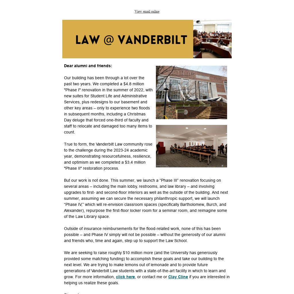 Our building has been through a lot over the past two years. We completed a $4.8 million "Phase I" renovation in the summer of 2022, with new suites for Student Life and Administrative Services, plus redesigns to our basement and other key areas – only to experience two floods in subsequent months, including a Christmas Day deluge that forced one-third of faculty and staff to relocate and damaged too many items to count. True to form, the Vanderbilt Law community rose to the challenge during the 2023-24 academic year, demonstrating resourcefulness, resilience, and optimism as we completed a $3.4 million "Phase II" restoration process. But our work is not done. This summer, we launch a “Phase III” renovation focusing on several areas – including the main lobby, restrooms, and law library – and involving upgrades to first- and second-floor interiors as well as the outside of the building. And next summer, assuming we can secure the necessary philanthropic support, we will launch “Phase IV,” which will re-envision classroom spaces (specifically Bartholomew, Burch, and Alexander), repurpose the first-floor locker room for a seminar room, and reimagine some of the Law Library space. Outside of insurance reimbursements for the flood-related work, none of this has been possible – and Phase IV simply will not be possible – without the generosity of our alumni and friends who, time and again, step up to support the Law School. We are seeking to raise roughly $10 million more (and the University has generously provided some matching funding) to accomplish these goals and take our building to the next level. We are trying to make lemons out of lemonade and to provide future generations of Vanderbilt Law students with a state-of-the-art facility in which to learn and grow. For more information, click here, or contact me or Clay Cline if you are interested in helping us realize these goals. Sincerely,
