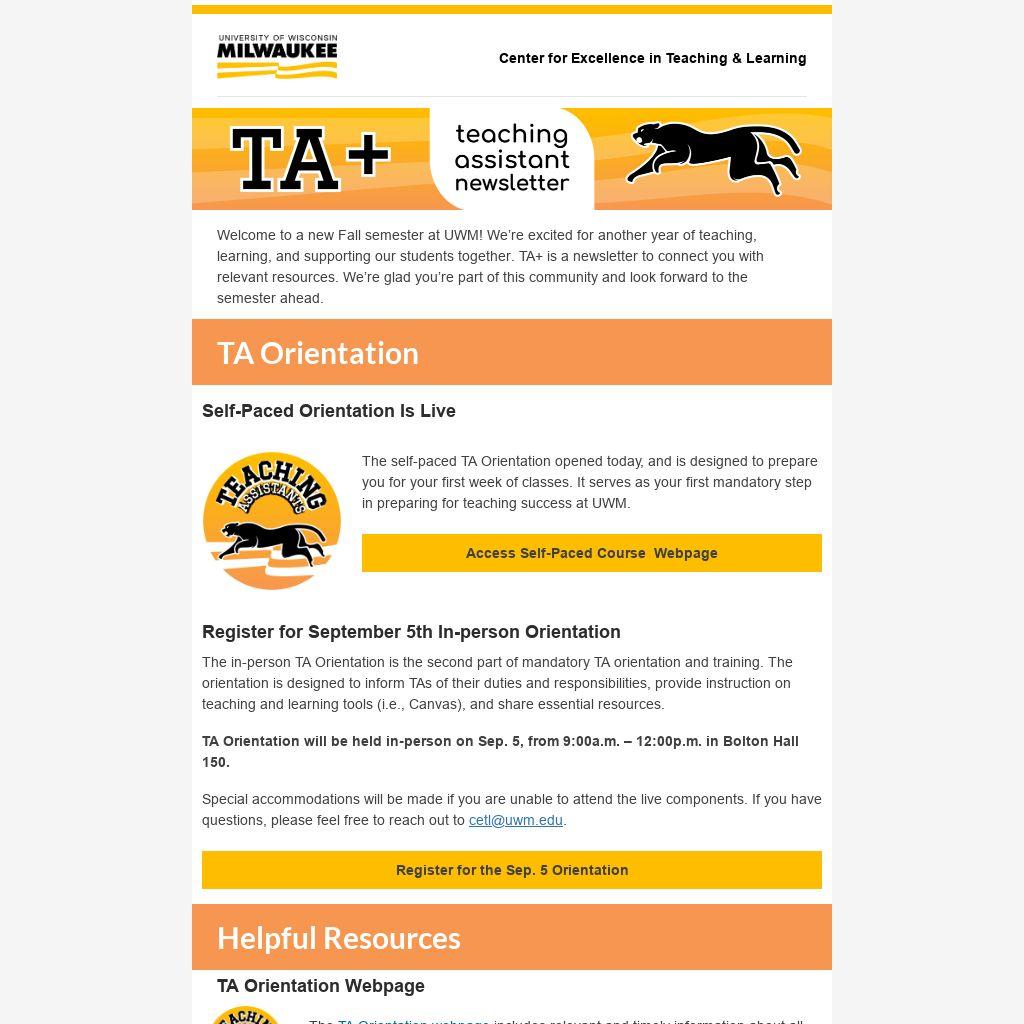 The in-person TA Orientation is the second part of mandatory TA orientation and training. The orientation is designed to inform TAs of their duties and responsibilities, provide instruction on teaching and learning tools (i.e., Canvas), and share essential resources.