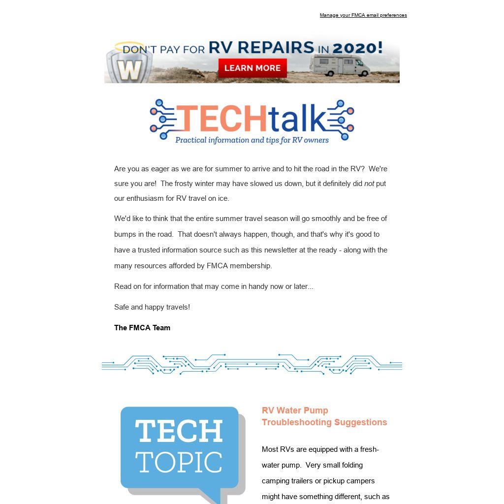 We'd like to think that the entire summer travel season will go smoothly and be free of bumps in the road. That doesn't always happen, though, and that's why it's good to have a trusted information source such as this newsletter at the ready - along with the many resources afforded by FMCA membership.