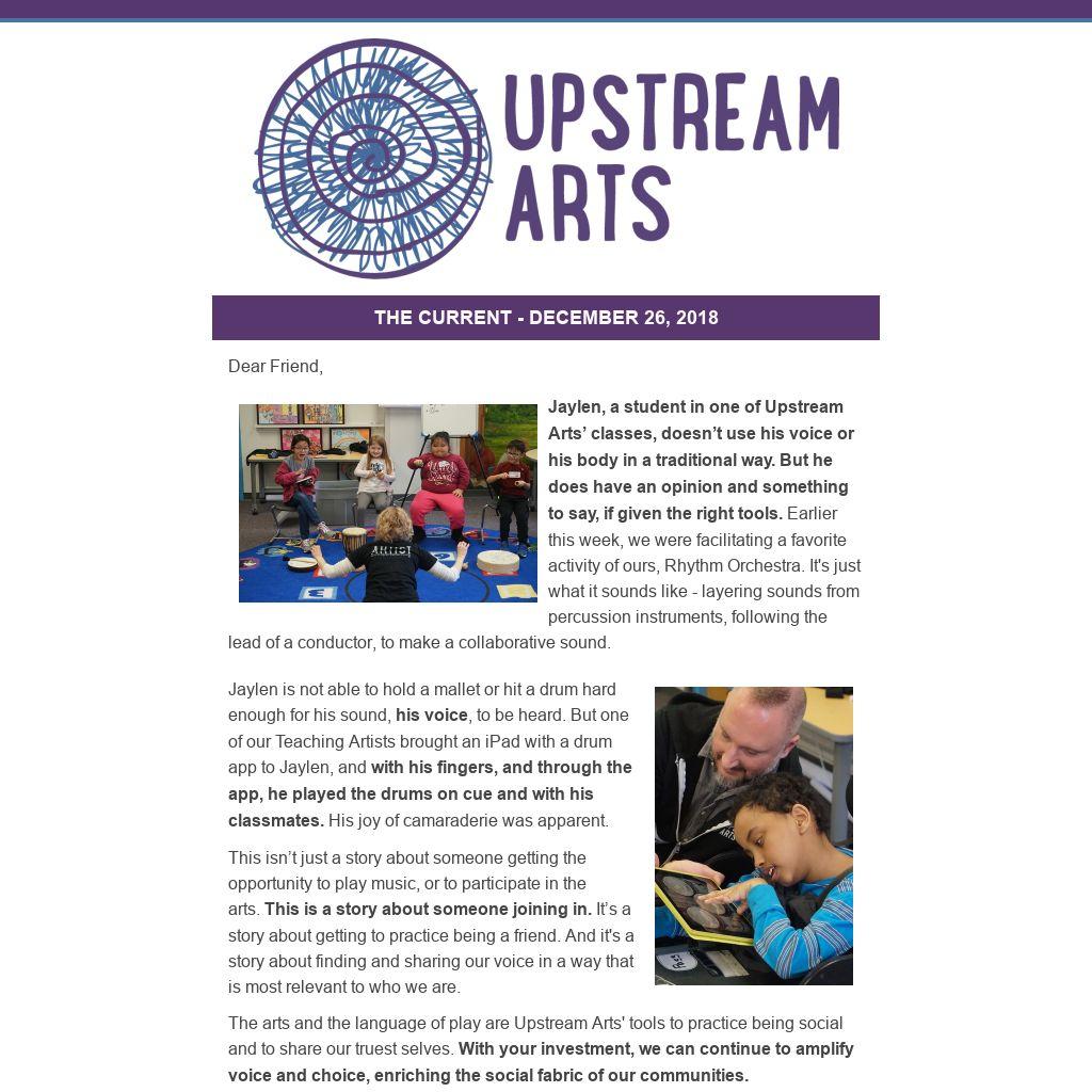 The arts and the language of play are Upstream Arts' tools to practice being social and to share our truest selves. With your investment, we can continue to amplify voice and choice, enriching the social fabric of our communities.