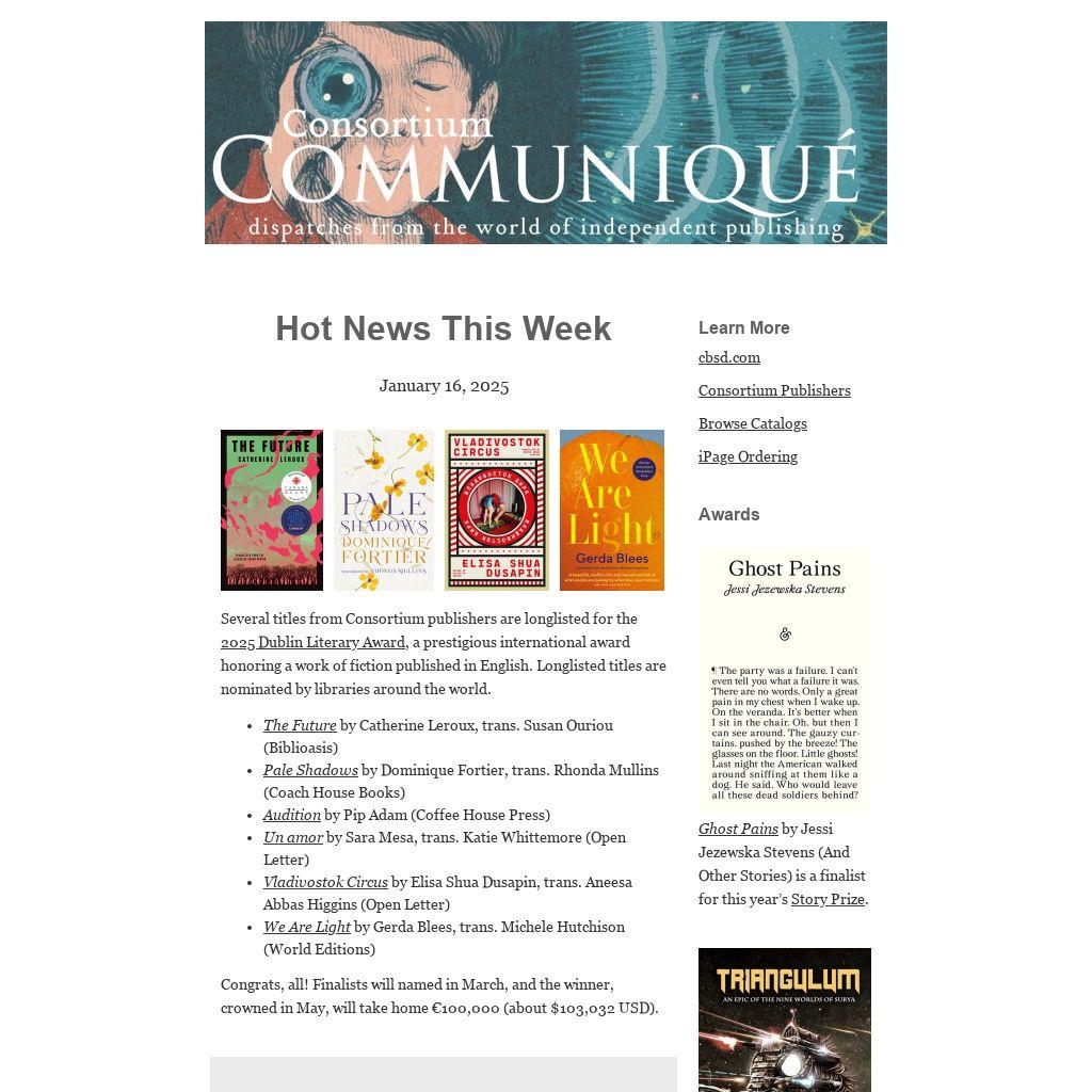 | Several titles from Consortium publishers are longlisted for the 2025 Dublin Literary Award, a prestigious international award honoring a work of fiction published in English. Longlisted titles are nominated by libraries around the world.