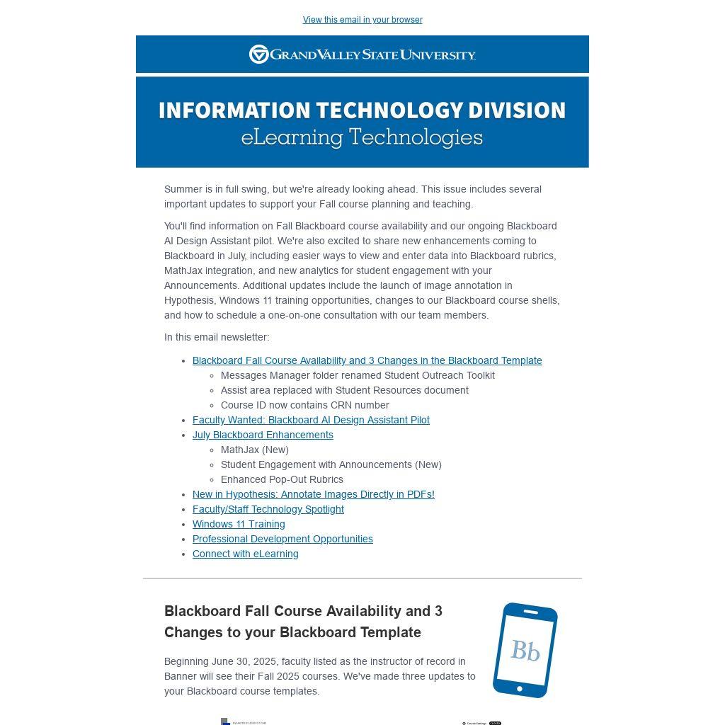 You'll find information on Fall Blackboard course availability and our ongoing Blackboard AI Design Assistant pilot. We're also excited to share new enhancements coming to Blackboard in July, including easier ways to view and enter data into Blackboard rubrics, MathJax integration, and new analytics for student engagement with your Announcements. Additional updates include the launch of image annotation in Hypothesis, Windows 11 training opportunities, changes to our Blackboard course shells, and how to schedule a one-on-one consultation with our team members.