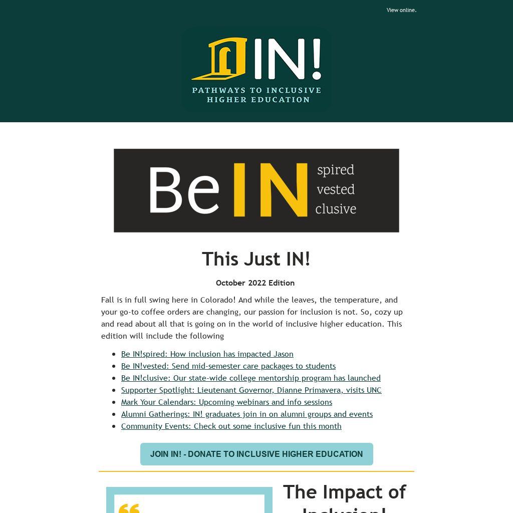 If you've graduated from an inclusive higher education program, then we invite you to our next alumni gathering. Come hang out with IN!'s young professional board members and your fellow graduates for drinks and/or non-alcoholic beverages. We'll spend time catching up with one another and continuing to build community.