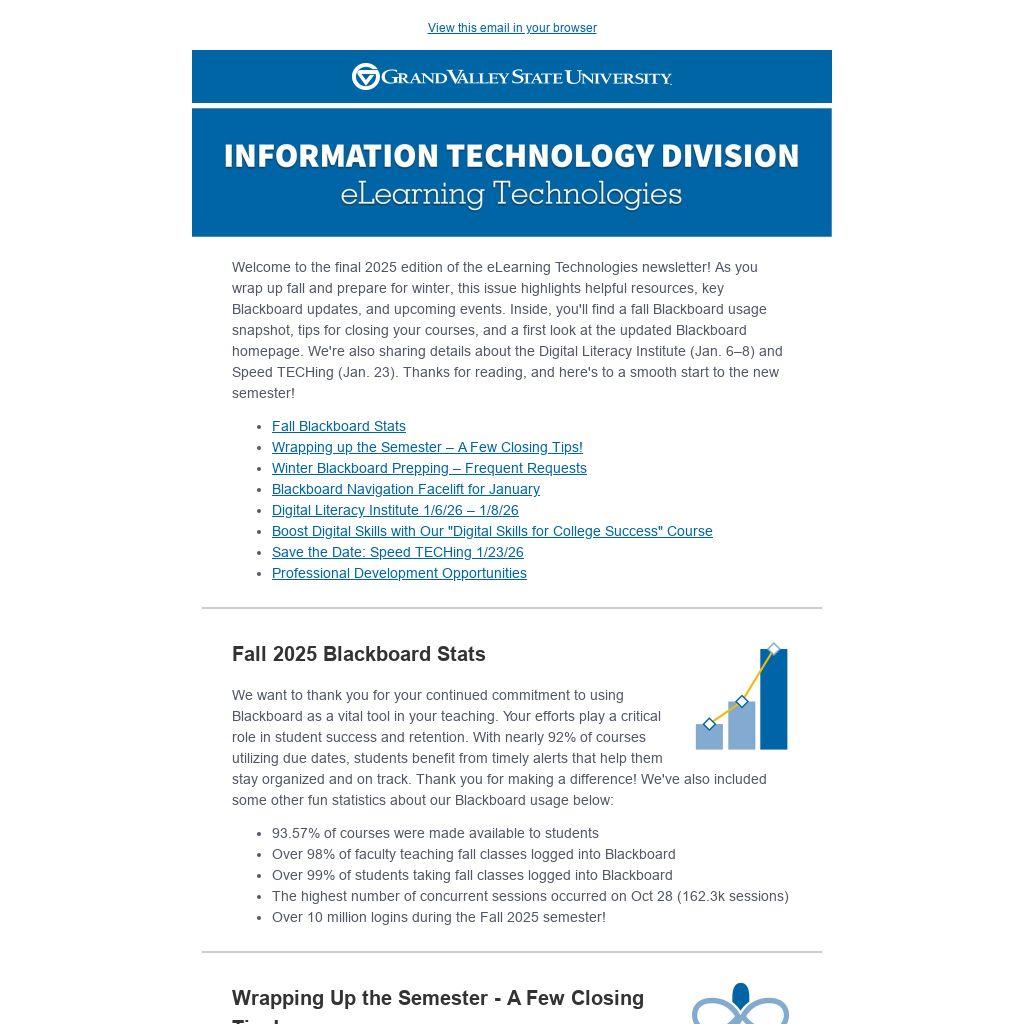 Welcome to the final 2025 edition of the eLearning Technologies newsletter! As you wrap up fall and prepare for winter, this issue highlights helpful resources, key Blackboard updates, and upcoming events. Inside, you'll find a fall Blackboard usage snapshot, tips for closing your courses, and a first look at the updated Blackboard homepage. We're also sharing details about the Digital Literacy Institute (Jan. 6–8) and Speed TECHing (Jan. 23). Thanks for reading, and here's to a smooth start to the new semester!