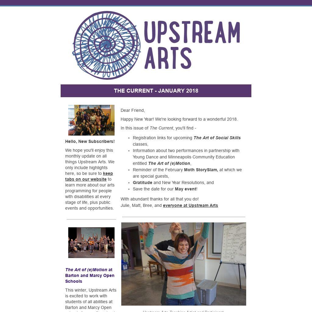 We hope you'll enjoy this monthly update on all things Upstream Arts. We only include highlights here, so be sure to keep tabs on our website to learn more about our arts programming for people with disabilities at every stage of life, plus public events and opportunities.