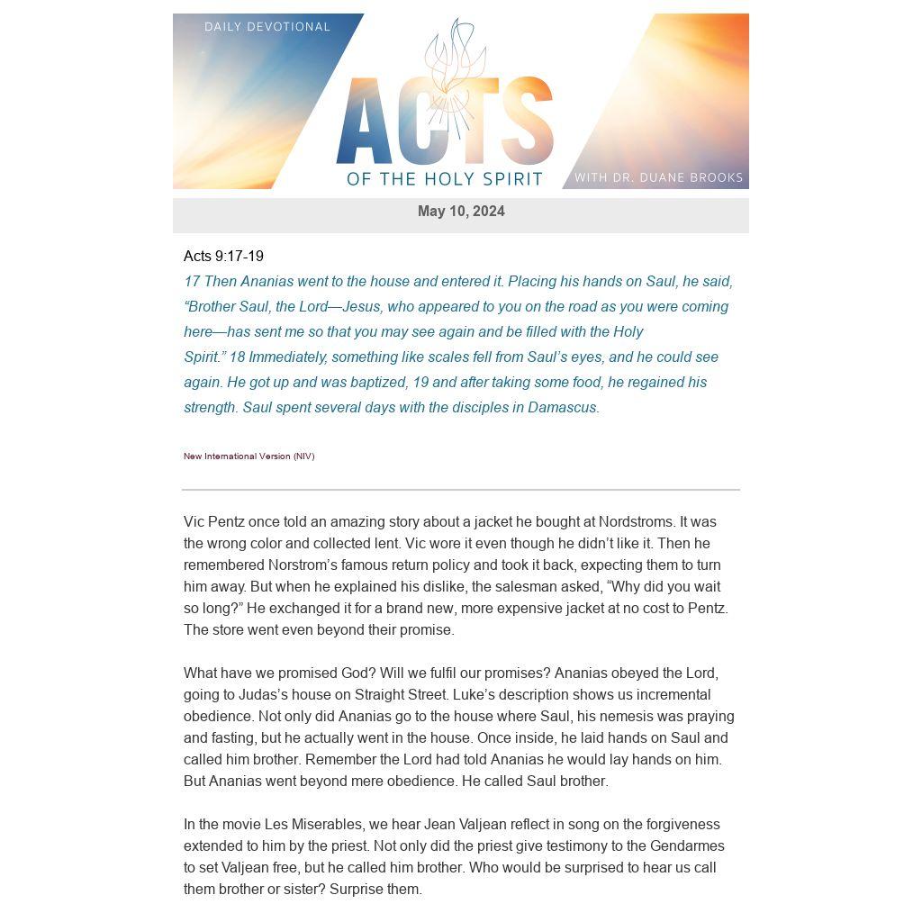 What have we promised God? Will we fulfil our promises? Ananias obeyed the Lord, going to Judas’s house on Straight Street. Luke’s description shows us incremental obedience. Not only did Ananias go to the house where Saul, his nemesis was praying and fasting, but he actually went in the house. Once inside, he laid hands on Saul and called him brother. Remember the Lord had told Ananias he would lay hands on him. But Ananias went beyond mere obedience. He called Saul brother.
