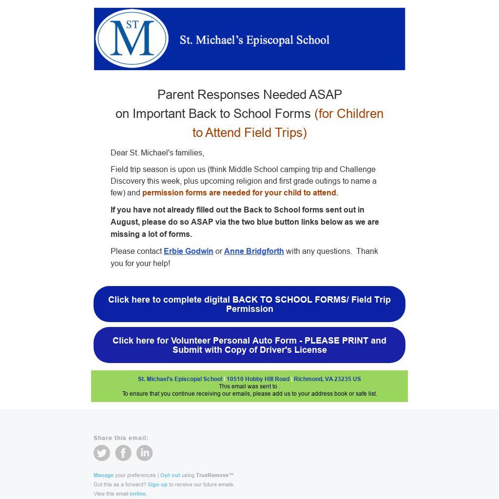 Field trip season is upon us (think Middle School camping trip and Challenge Discovery this week, plus upcoming religion and first grade outings to name a few) and permission forms are needed for your child to attend.