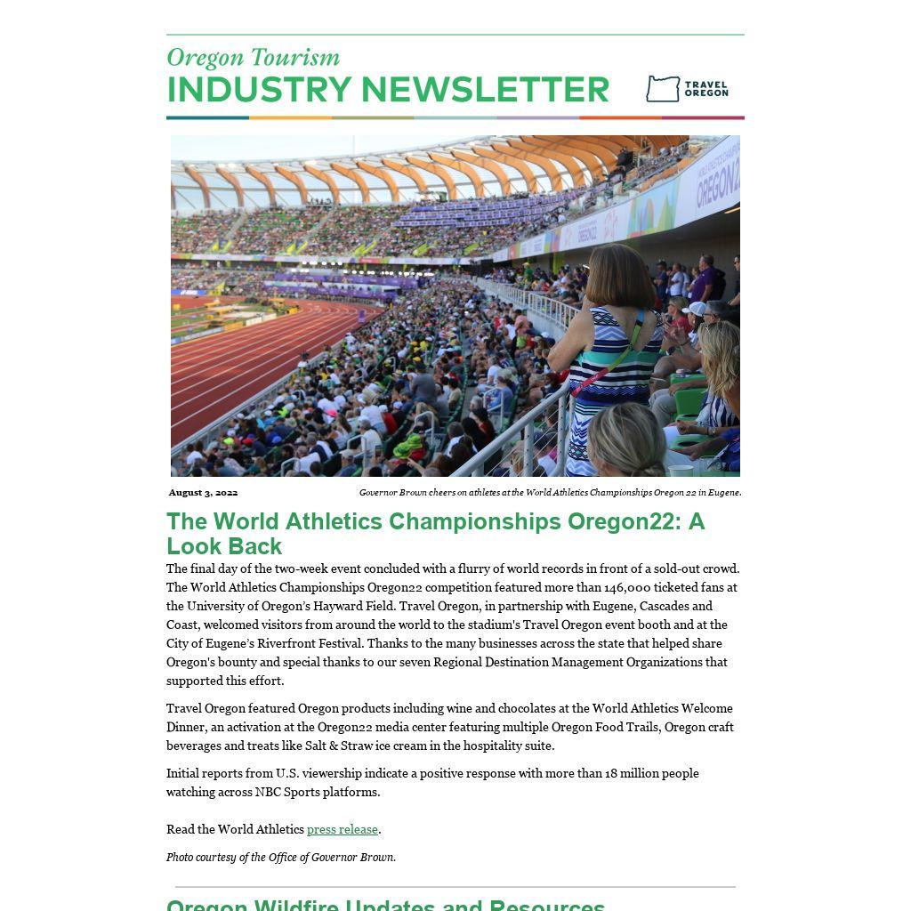 The final day of the two-week event concluded with a flurry of world records in front of a sold-out crowd. The World Athletics Championships Oregon22 competition featured more than 146,000 ticketed fans at the University of Oregon’s Hayward Field. Travel Oregon, in partnership with Eugene, Cascades and Coast, welcomed visitors from around the world to the stadium's Travel Oregon event booth and at the City of Eugene’s Riverfront Festival. Thanks to the many businesses across the state that helped share Oregon's bounty and special thanks to our seven Regional Destination Management Organizations that supported this effort.