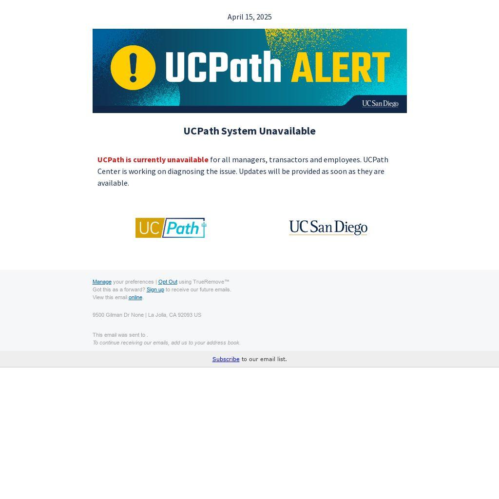 UCPath is currently unavailable for all managers, transactors and employees. UCPath Center is working on diagnosing the issue. Updates will be provided as soon as they are available.