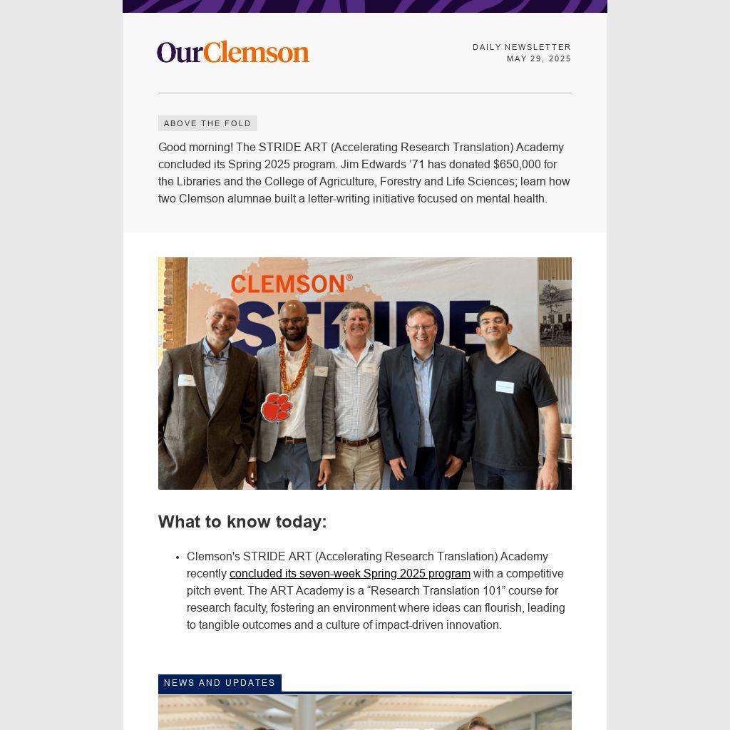 Good morning! The STRIDE ART (Accelerating Research Translation) Academy concluded its Spring 2025 program. Jim Edwards ’71 has donated $650,000 for the Libraries and the College of Agriculture, Forestry and Life Sciences; learn how two Clemson alumnae built a letter-writing initiative focused on mental health.