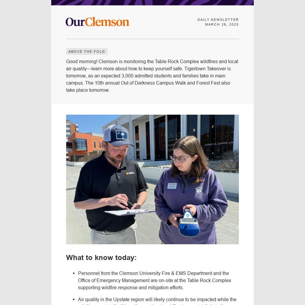 Good morning! Clemson is monitoring the Table Rock Complex wildfires and local air quality—learn more about how to keep yourself safe. Tigertown Takeover is tomorrow, as an expected 3,000 admitted students and families take in main campus. The 10th annual Out of Darkness Campus Walk and Forest Fest also take place tomorrow.