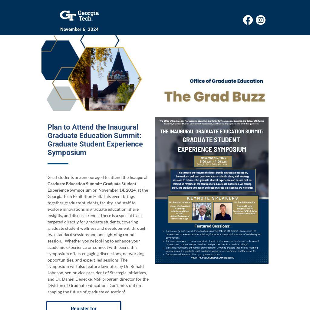 Grad students are encouraged to attend the Inaugural Graduate Education Summit: Graduate Student Experience Symposium on November 14, 2024, at the Georgia Tech Exhibition Hall. This event brings together graduate students, faculty, and staff to explore innovations in graduate education, share insights, and discuss trends. There is a special track targeted directly for graduate students, covering graduate student wellness and development, through two standard sessions and one lightning round session. Whether you're looking to enhance your academic experience or connect with peers, this symposium offers engaging discussions, networking opportunities, and expert-led sessions. The symposium will also feature keynotes by Dr. Ronald Johnson, senior vice president of Strategic Initiatives, and Dr. Daniel Denecke, NSF program director for the Division of Graduate Education. Don't miss out on shaping the future of graduate education!