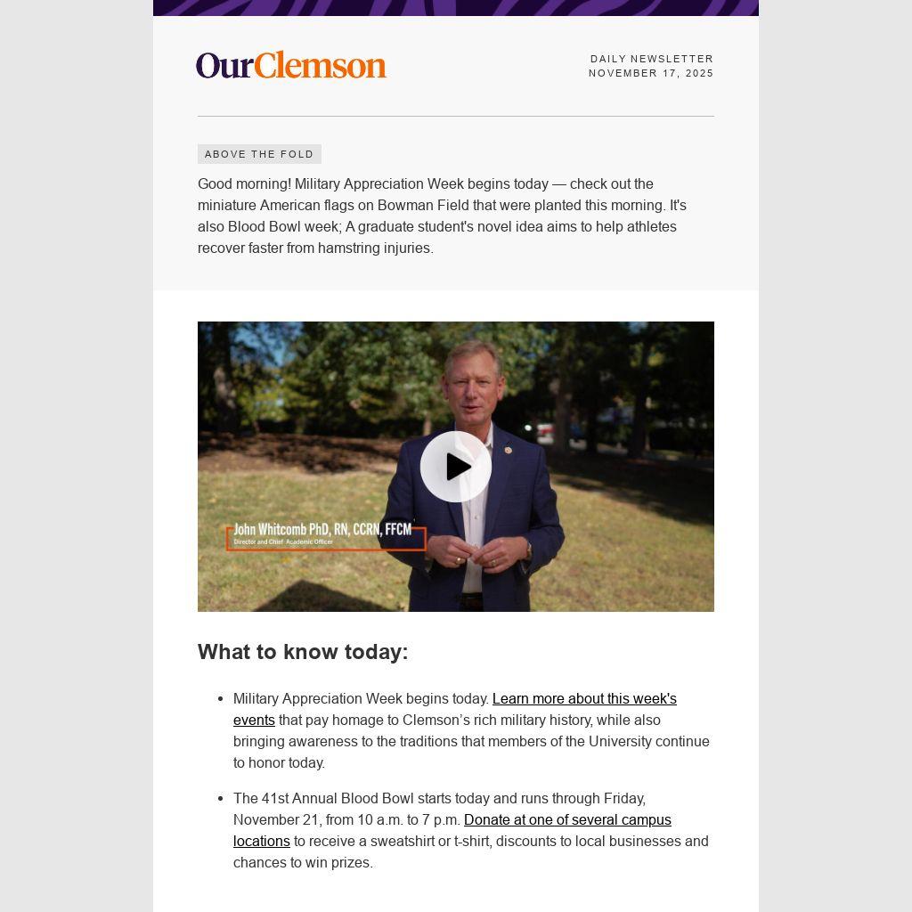 Good morning! Military Appreciation Week begins today — check out the miniature American flags on Bowman Field that were planted this morning. It's also Blood Bowl week; A graduate student's novel idea aims to help athletes recover faster from hamstring injuries.