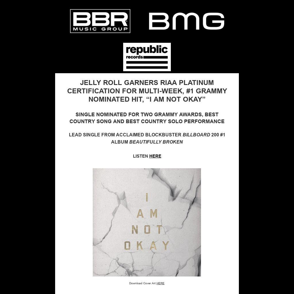 Nashville, TN (December 12, 2024) – Award-winning multi-genre phenomenon Jelly Roll has now garnered a Platinum certification from the RIAA for his 2024 smash single “I Am Not Okay”—as announced today. The song graces his blockbuster Billboard 200 #1 critically acclaimed sophomore country album, Beautifully Broken.