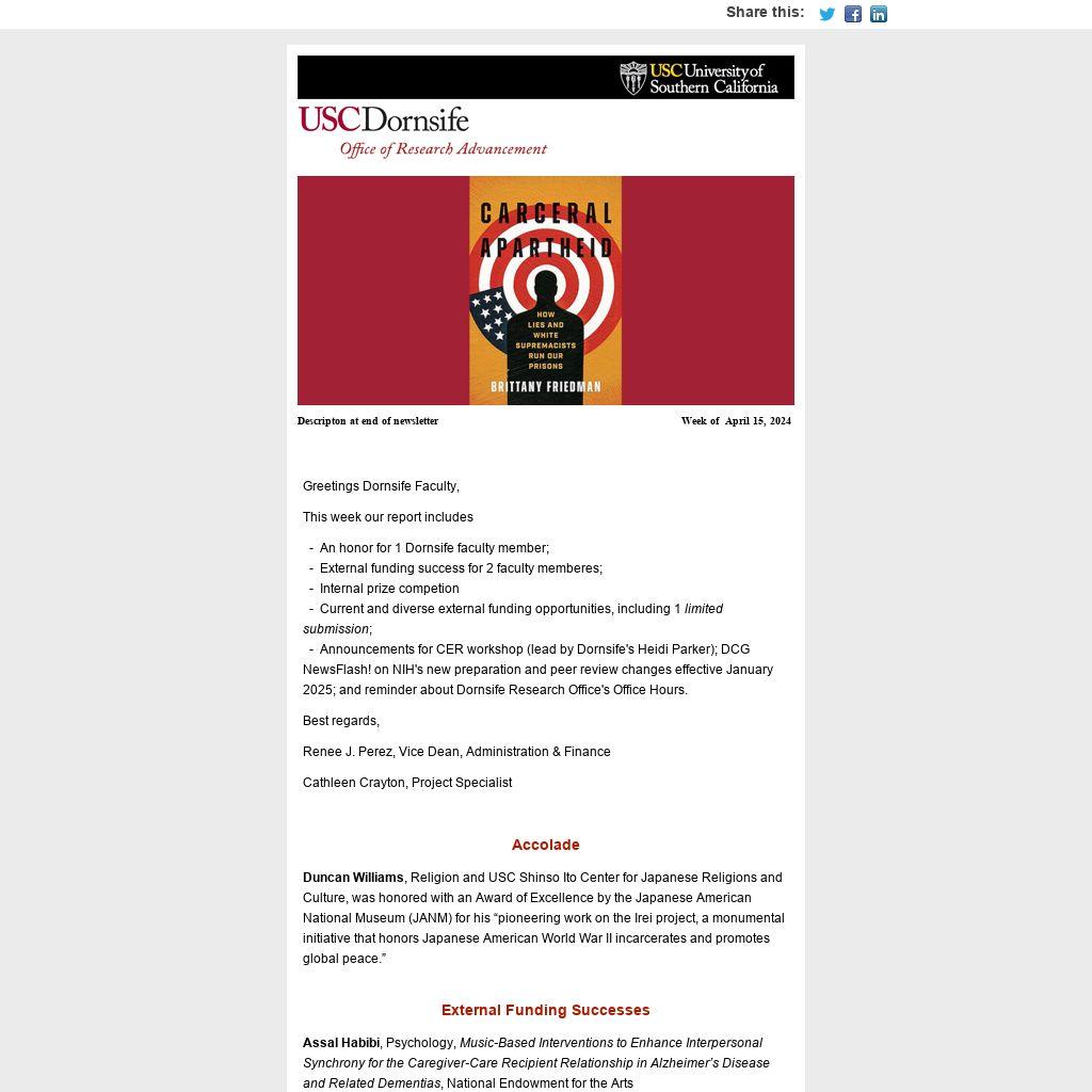 - An honor for 1 Dornsife faculty member; - External funding success for 2 faculty memberes; - Internal prize competion - Current and diverse external funding opportunities, including 1 limited submission; - Announcements for CER workshop (lead by Dornsife's Heidi Parker); DCG NewsFlash! on NIH's new preparation and peer review changes effective January 2025; and reminder about Dornsife Research Office's Office Hours.