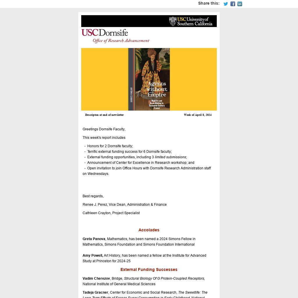 - Honors for 2 Dornsife faculty; - Terrific external funding success for 6 Dornsife faculty; - External funding opportunities, including 3 limited submissions; - Announcement of Center for Excellence in Research workshop; and - Open invitation to join Office Hours with Dornsife Research Administration staff on Wednesdays.