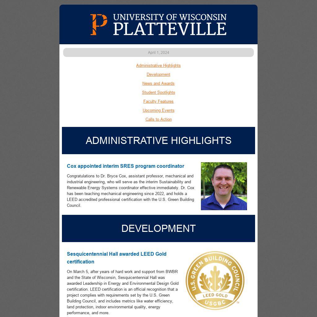 Congratulations to Dr. Bryce Cox, assistant professor, mechanical and industrial engineering, who will serve as the interim Sustainability and Renewable Energy Systems coordinator effective immediately. Dr. Cox has been teaching mechanical engineering since 2022, and holds a LEED accredited professional certification with the U.S. Green Building Council.