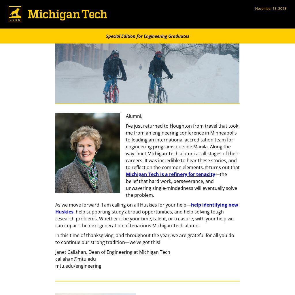 help identifying new Huskies, help supporting study abroad opportunities, and help solving tough research problems. Whether it be your time, talent, or treasure, with your help we can impact the next generation of tenacious Michigan Tech alumni.