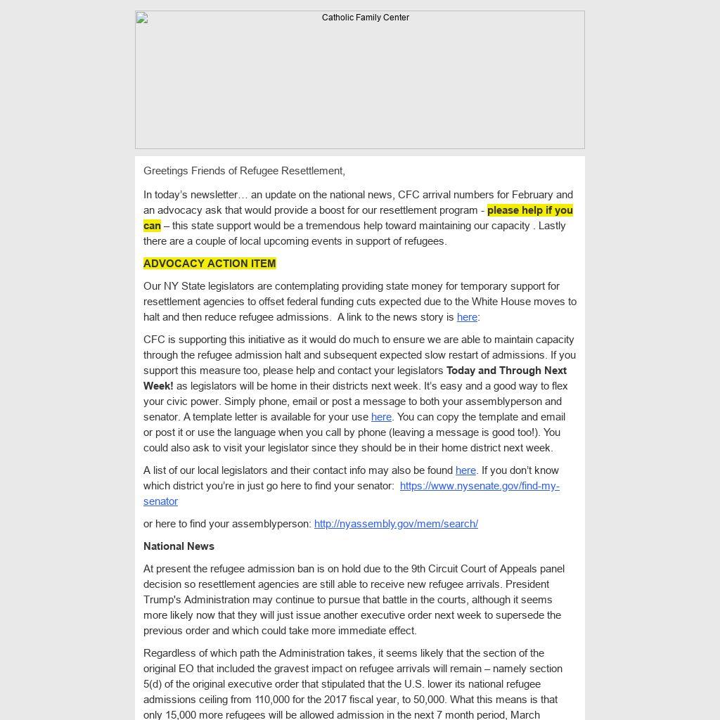In today’s newsletter… an update on the national news, CFC arrival numbers for February and an advocacy ask that would provide a boost for our resettlement program - please help if you can – this state support would be a tremendous help toward maintaining our capacity . Lastly there are a couple of local upcoming events in support of refugees.