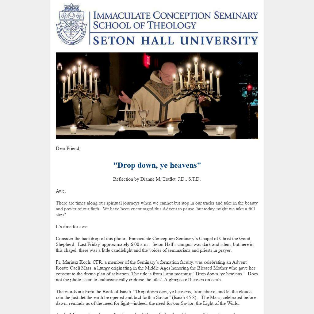 Fr. Mariusz Koch, CFR, a member of the Seminary’s formation faculty, was celebrating an Advent Rorate Caeli Mass, a liturgy originating in the Middle Ages honoring the Blessed Mother who gave her consent to the divine plan of salvation. The title is from Latin meaning: “Drop down, ye heavens.” Does not the photo seem to enthusiastically endorse the title? A glimpse of heaven on earth.