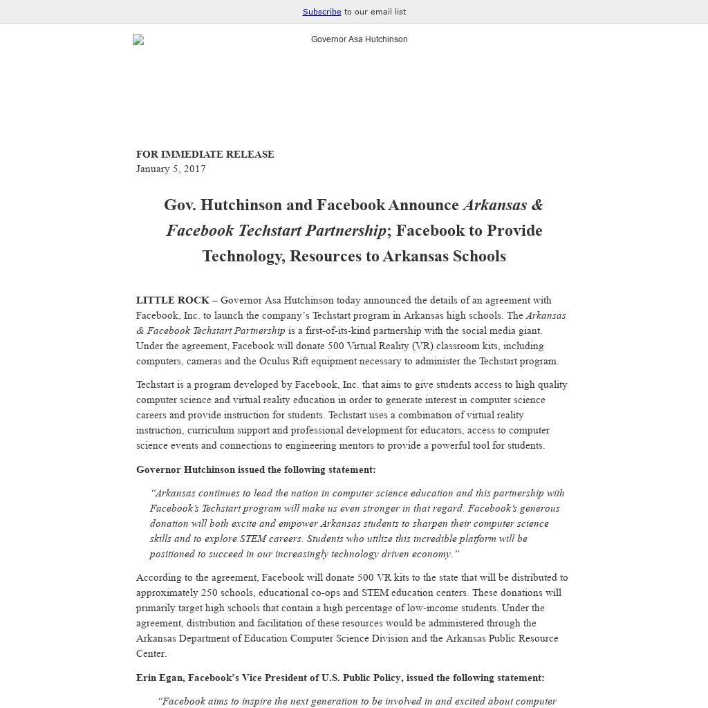 LITTLE ROCK – Governor Asa Hutchinson today announced the details of an agreement with Facebook, Inc. to launch the company’s Techstart program in Arkansas high schools. The Arkansas & Facebook Techstart Partnership is a first-of-its-kind partnership with the social media giant. Under the agreement, Facebook will donate 500 Virtual Reality (VR) classroom kits, including computers, cameras and the Oculus Rift equipment necessary to administer the Techstart program.