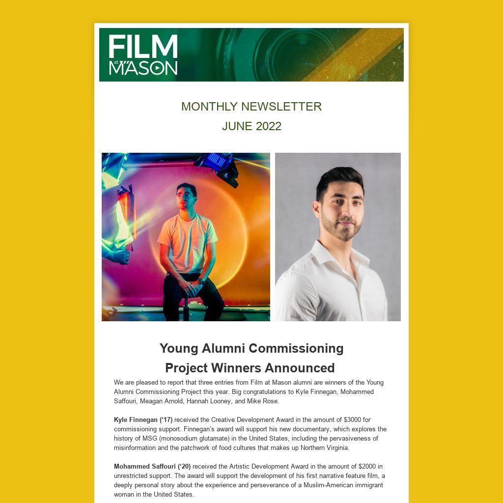 Young Alumni Commissioning Project Winners Announced We are pleased to report that three entries from Film at Mason alumni are winners of the Young Alumni Commissioning Project this year. Big congratulations to Kyle Finnegan, Mohammed Saffouri, Meagan Arnold, Hannah Looney, and Mike Rose.