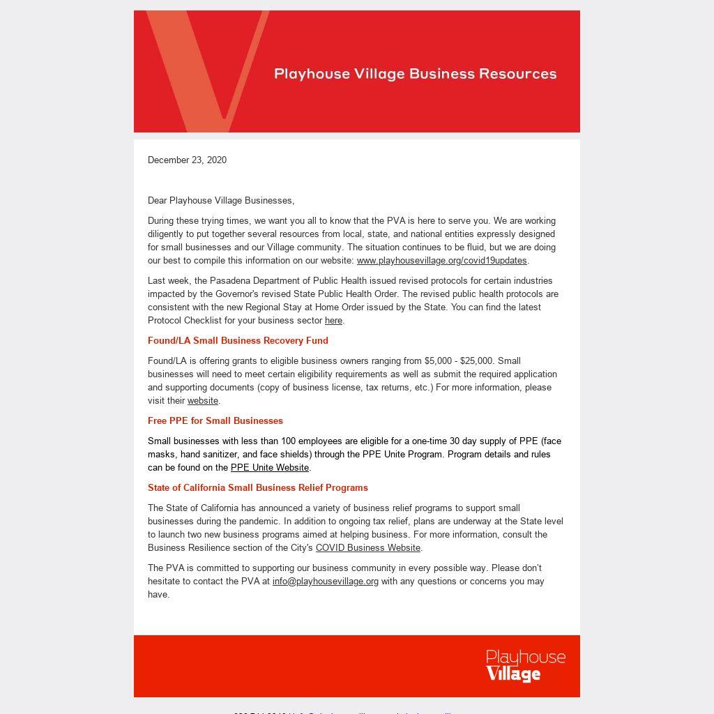 The PVA is committed to supporting our business community in every possible way. Please don’t hesitate to contact the PVA at info@playhousevillage.org with any questions or concerns you may have.