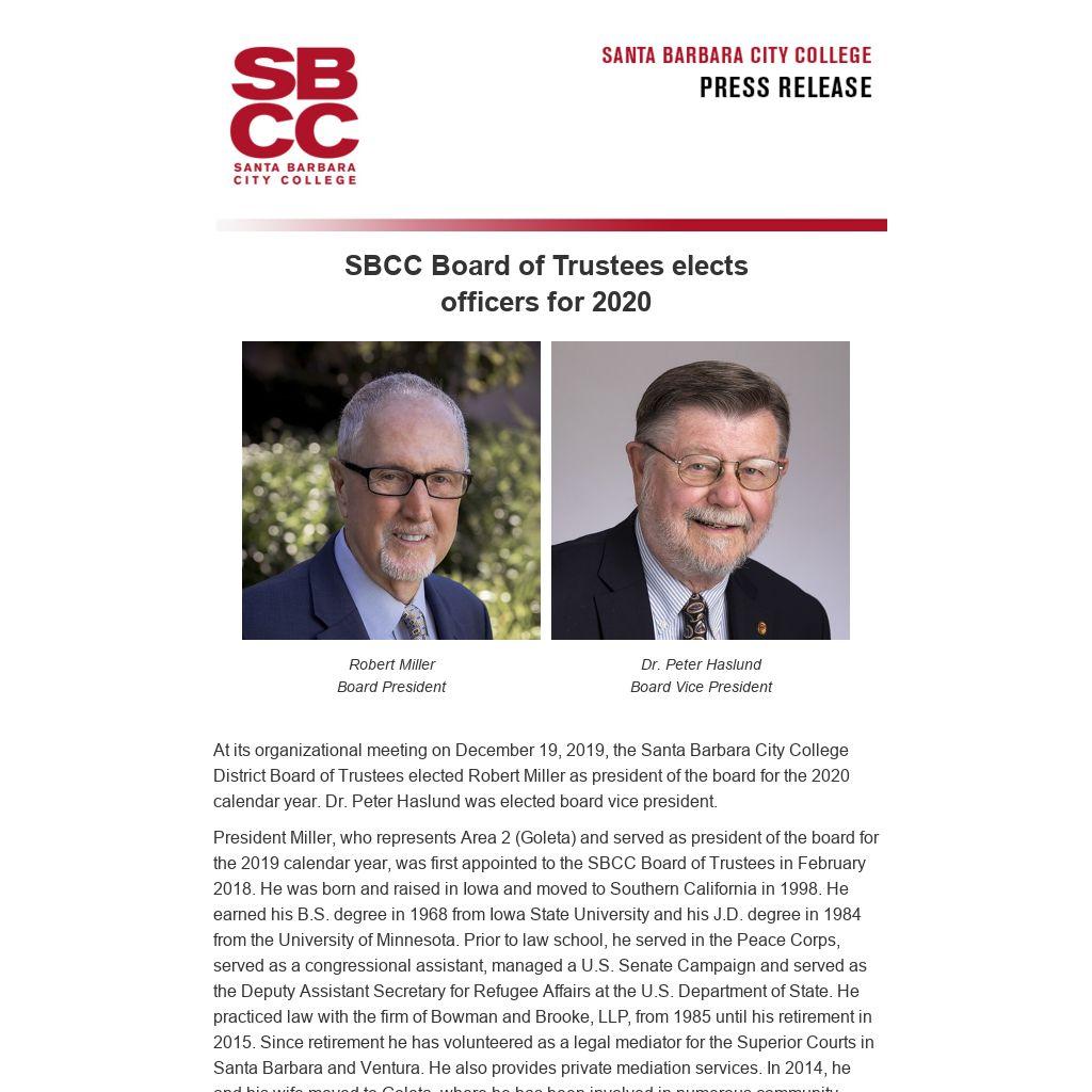 At its organizational meeting on December 19, 2019, the Santa Barbara City College District Board of Trustees elected Robert Miller as president of the board for the 2020 calendar year. Dr. Peter Haslund was elected board vice president.