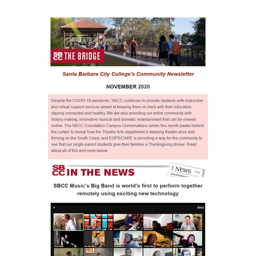 Despite the COVID-19 pandemic, SBCC continues to provide students with instruction and virtual support services aimed at keeping them on track with their education, staying connected and healthy. We are also providing our entire community with history-making, innovative musical and dramatic entertainment that can be viewed online. The SBCC Foundation Campus Conversations series this month peeks behind the curtain to reveal how the Theatre Arts department is keeping theatre alive and thriving on the South Coast, and EOPS/CARE is providing a way for the community to see that our single-parent students give their families a Thanksgiving dinner. Read about all of this and more below.