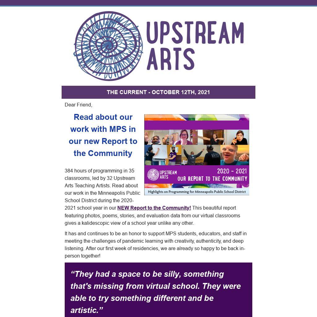384 hours of programming in 35 classrooms, led by 32 Upstream Arts Teaching Artists. Read about our work in the Minneapolis Public School District during the 2020-2021 school year in our NEW Report to the Community! This beautiful report featuring photos, poems, stories, and evaluation data from our virtual classrooms gives a kalidescopic view of a school year unlike any other.