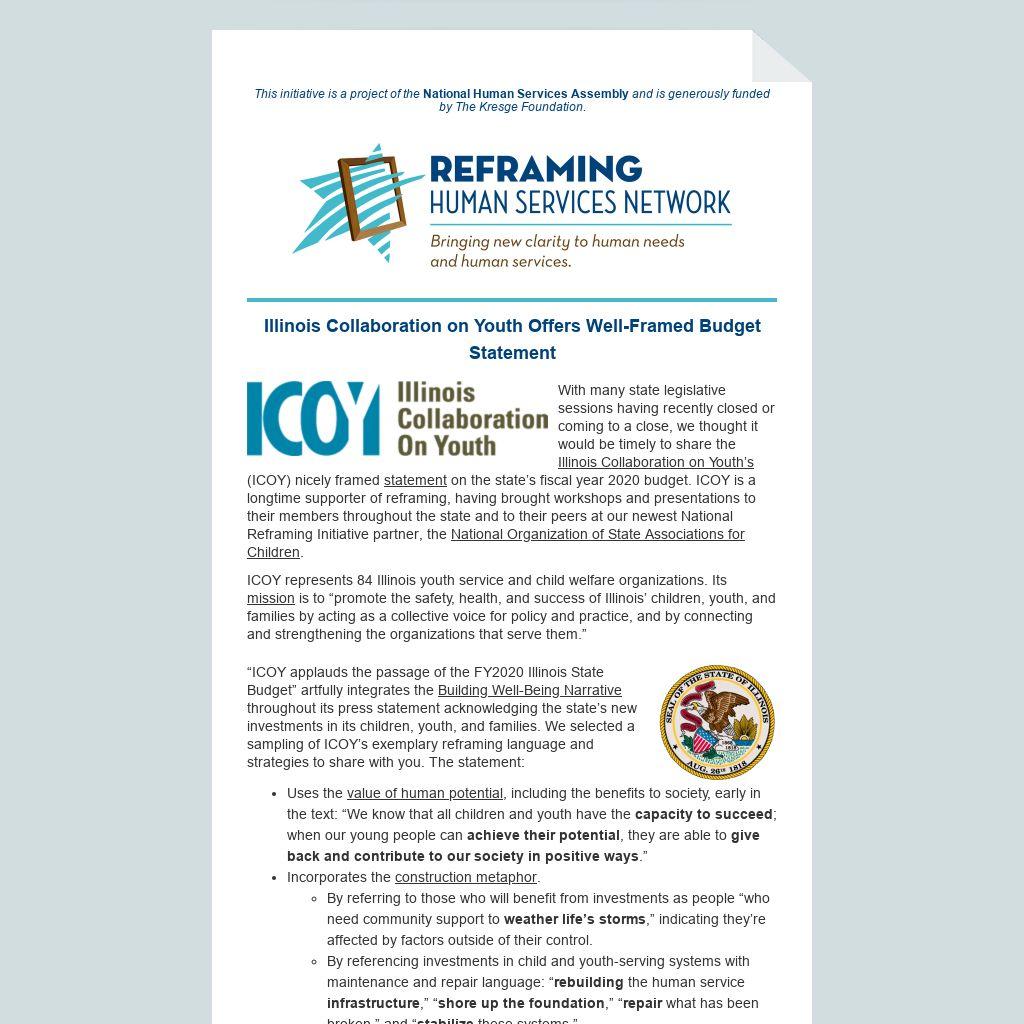 “ICOY applauds the passage of the FY2020 Illinois State Budget” artfully integrates the Building Well-Being Narrative throughout its press statement acknowledging the state’s new investments in its children, youth, and families. We selected a sampling of ICOY’s exemplary reframing language and strategies to share with you. The statement: