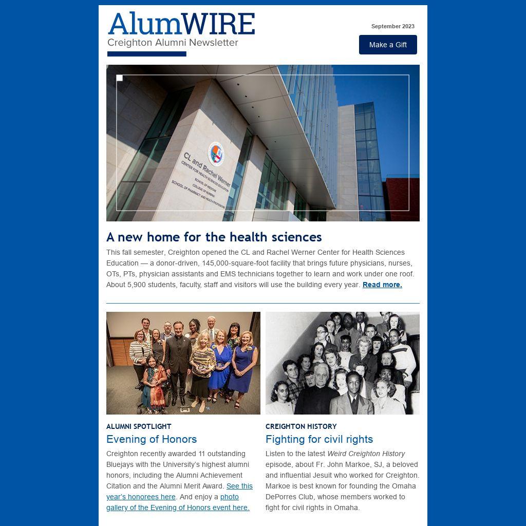 This fall semester, Creighton opened the CL and Rachel Werner Center for Health Sciences Education — a donor-driven, 145,000-square-foot facility that brings future physicians, nurses, OTs, PTs, physician assistants and EMS technicians together to learn and work under one roof. About 5,900 students, faculty, staff and visitors will use the building every year. Read more.