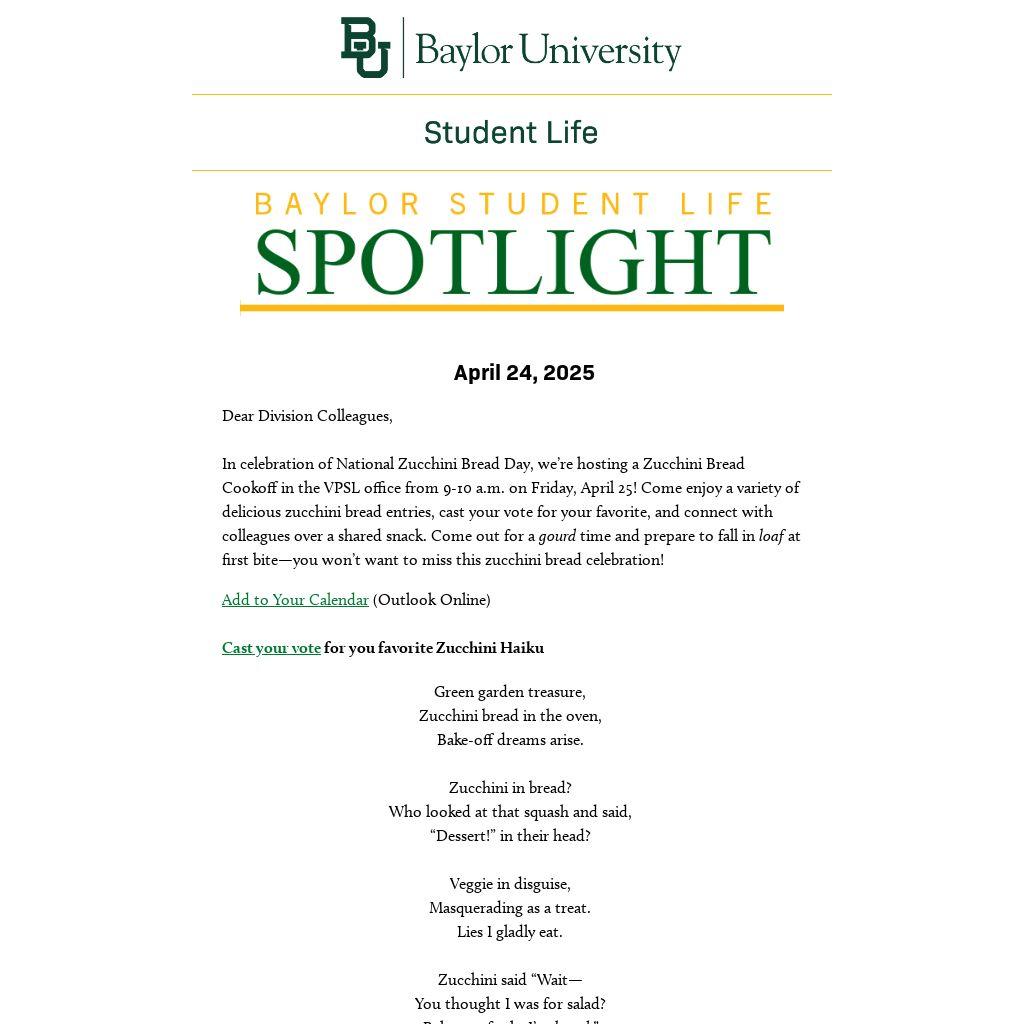 In celebration of National Zucchini Bread Day, we’re hosting a Zucchini Bread Cookoff in the VPSL office from 9-10 a.m. on Friday, April 25! Come enjoy a variety of delicious zucchini bread entries, cast your vote for your favorite, and connect with colleagues over a shared snack. Come out for a gourd time and prepare to fall in loaf at first bite—you won’t want to miss this zucchini bread celebration!