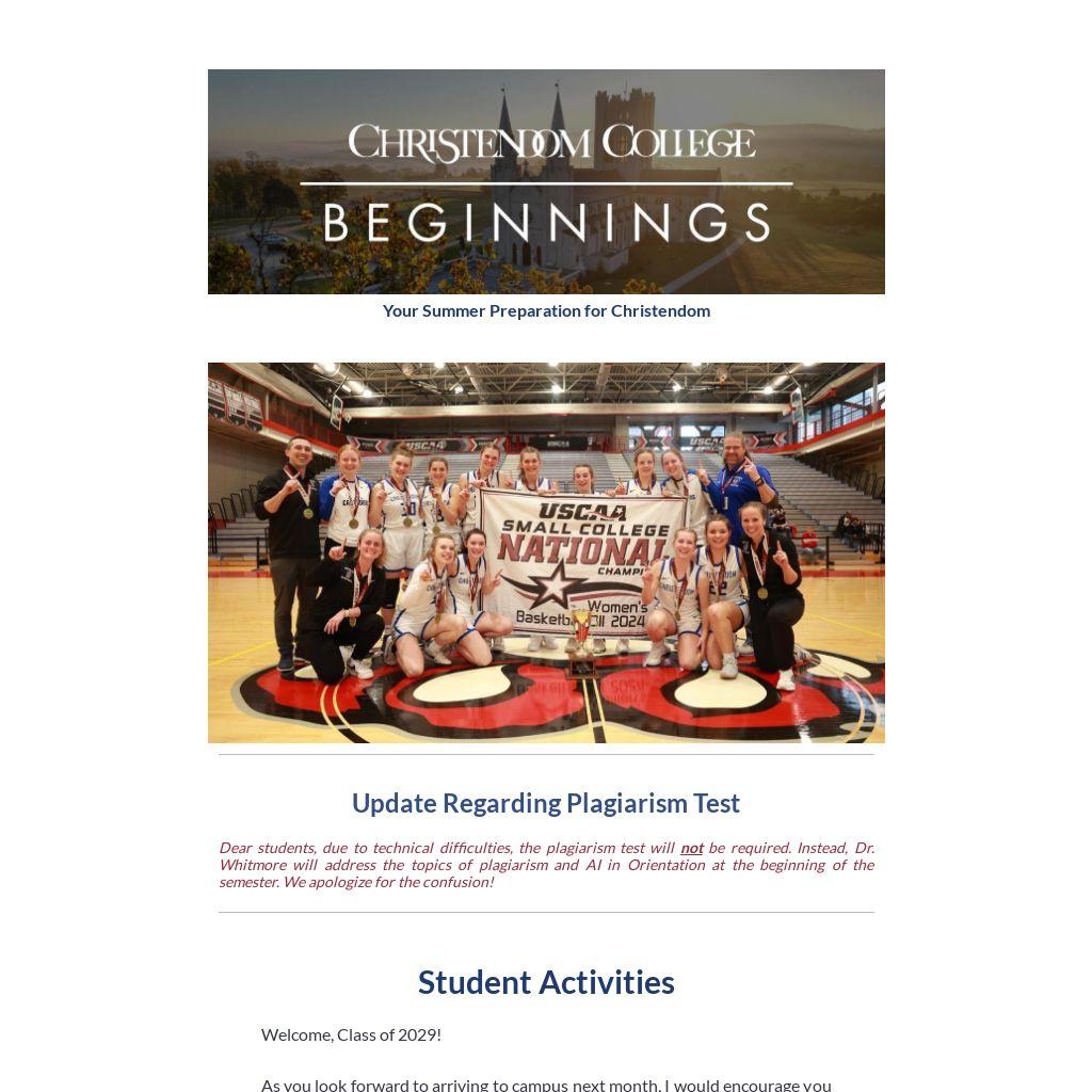 As you look forward to arriving to campus next month, I would encourage you to start thinking of the ways that you might like to get involved on campus. Right off the bat, you will see one of Christendom’s lead organizations in action. The Student Activities Council (SAC) will be organizing events such as the Friday Night Social, the Gym Night and the Barn Dance (see online Student Activities Calendar). SAC is a fantastic way to get involved, developing one's creative ideas and leadership abilities. SAC is made up of thirty-five volunteers, one of which will be the Freshmen Class President. Being a class president will give you the opportunity to serve your class and participate in several committees as well as coordinate and host the Country Contra Night during Parents and Family Weekend. Information about the election process will be provided during orientation. Another way to get involved is to join or start a club. There are currently around eighteen active clubs that range from the politics to pro-life groups. To see a full list, follow this link to the Student Clubs Page. One of the beautiful things about Christendom is the wide range of opportunities that there are for leadership and involvement. So, start thinking about getting involved and joining one of the many groups on campus! I look forward to welcoming you in a few weeks!