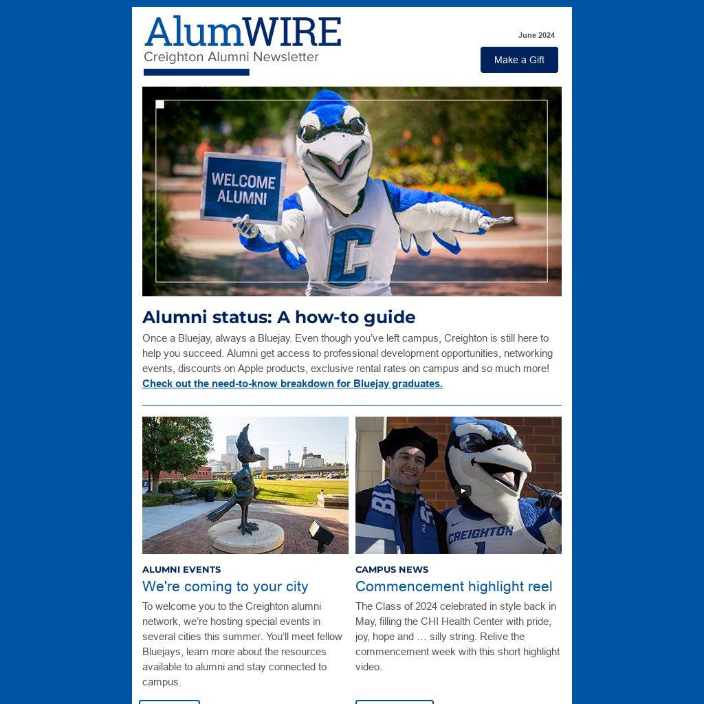 To welcome you to the Creighton alumni network, we’re hosting special events in several cities this summer. You’ll meet fellow Bluejays, learn more about the resources available to alumni and stay connected to campus.