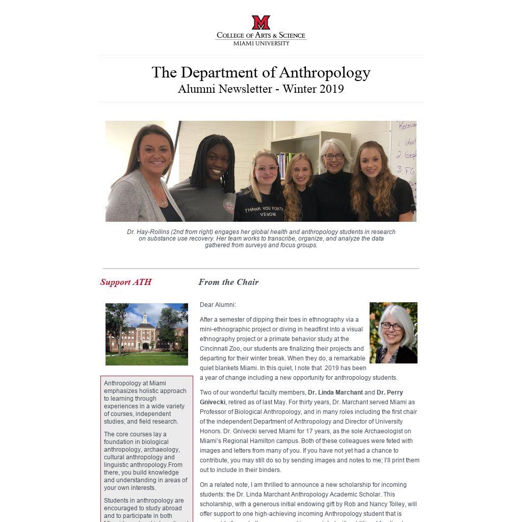 On a related note, I am thrilled to announce a new scholarship for incoming students: the Dr. Linda Marchant Anthropology Academic Scholar. This scholarship, with a generous initial endowing gift by Rob and Nancy Tolley, will offer support to one high-achieving incoming Anthropology student that is renewable for up to three years and is associated with additional funding to allow the student to pursue research. The Dr. Linda Marchant Anthropology Academic Scholarship helps to enable the best and brightest students an opportunity to study Anthropology at Miami University and become one of our alumni. In their note about their gift, Rob and Nancy Tolley wrote that they give so that “Somewhere in the future, unknown and undocumented to any of us, a Miami alumnus will help someone in some quiet way.”