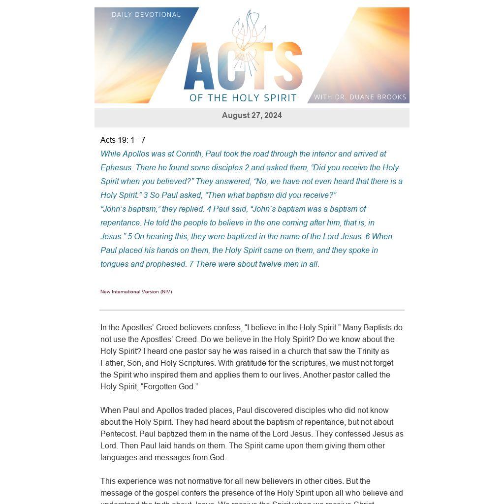 When Paul and Apollos traded places, Paul discovered disciples who did not know about the Holy Spirit. They had heard about the baptism of repentance, but not about Pentecost. Paul baptized them in the name of the Lord Jesus. They confessed Jesus as Lord. Then Paul laid hands on them. The Spirit came upon them giving them other languages and messages from God.
