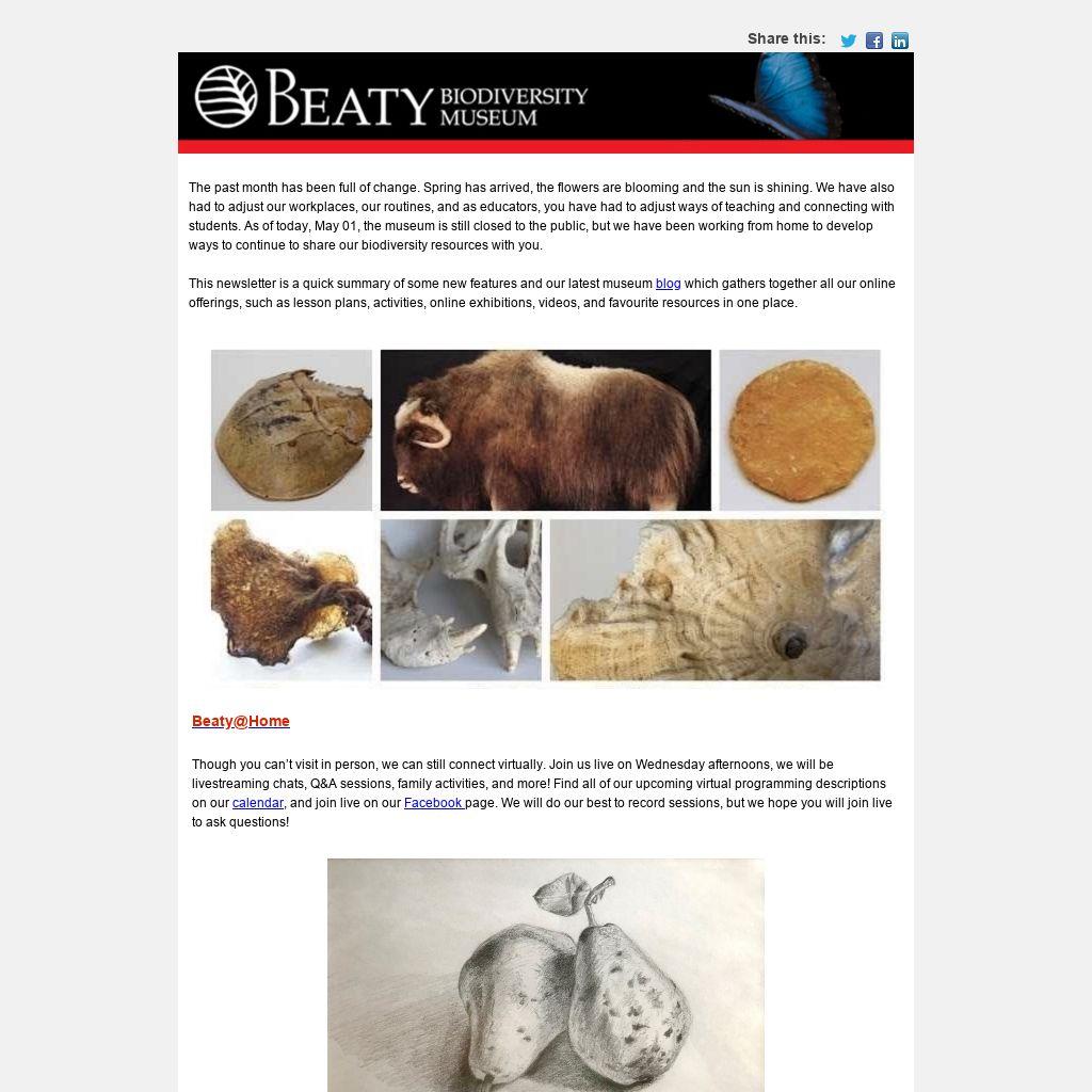 The past month has been full of change. Spring has arrived, the flowers are blooming and the sun is shining. We have also had to adjust our workplaces, our routines, and as educators, you have had to adjust ways of teaching and connecting with students. As of today, May 01, the museum is still closed to the public, but we have been working from home to develop ways to continue to share our biodiversity resources with you.