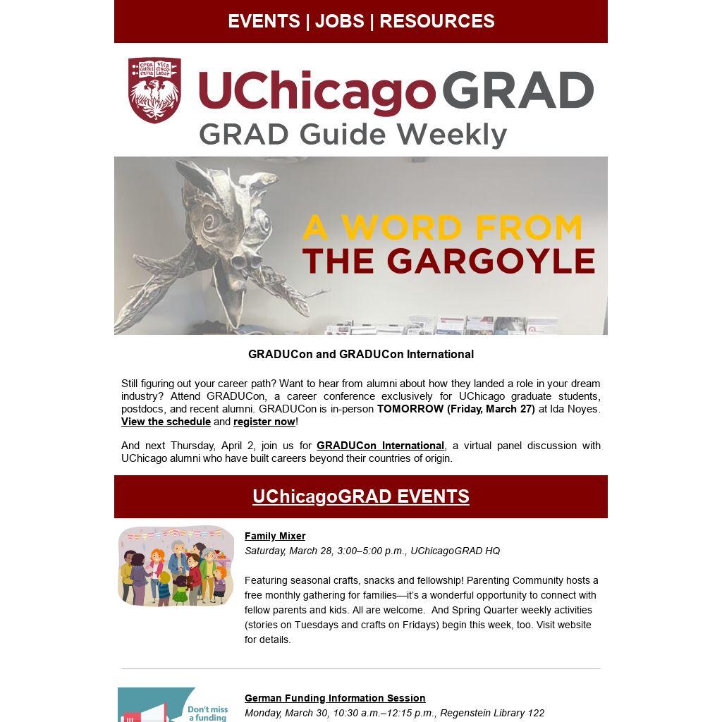 Still figuring out your career path? Want to hear from alumni about how they landed a role in your dream industry? Attend GRADUCon, a career conference exclusively for UChicago graduate students, postdocs, and recent alumni. GRADUCon is in-person TOMORROW (Friday, March 27) at Ida Noyes. View the schedule and register now!