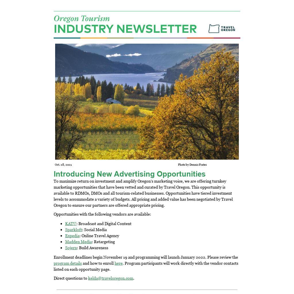 To maximize return on investment and amplify Oregon’s marketing voice, we are offering turnkey marketing opportunities that have been vetted and curated by Travel Oregon. This opportunity is available to RDMOs, DMOs and all tourism-related businesses. Opportunities have tiered investment levels to accommodate a variety of budgets. All pricing and added value has been negotiated by Travel Oregon to ensure our partners are offered appropriate pricing.