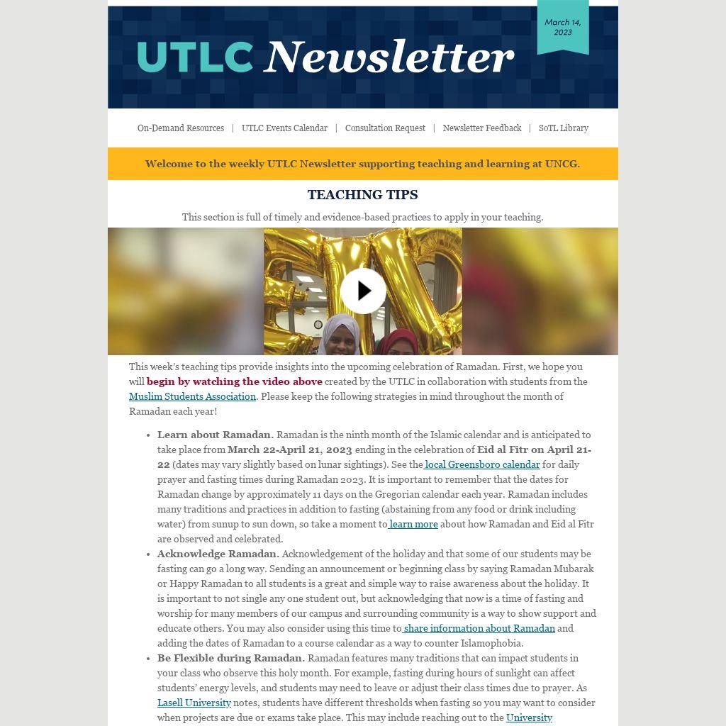 Welcome to the weekly UTLC Newsletter supporting teaching and learning at UNCG.