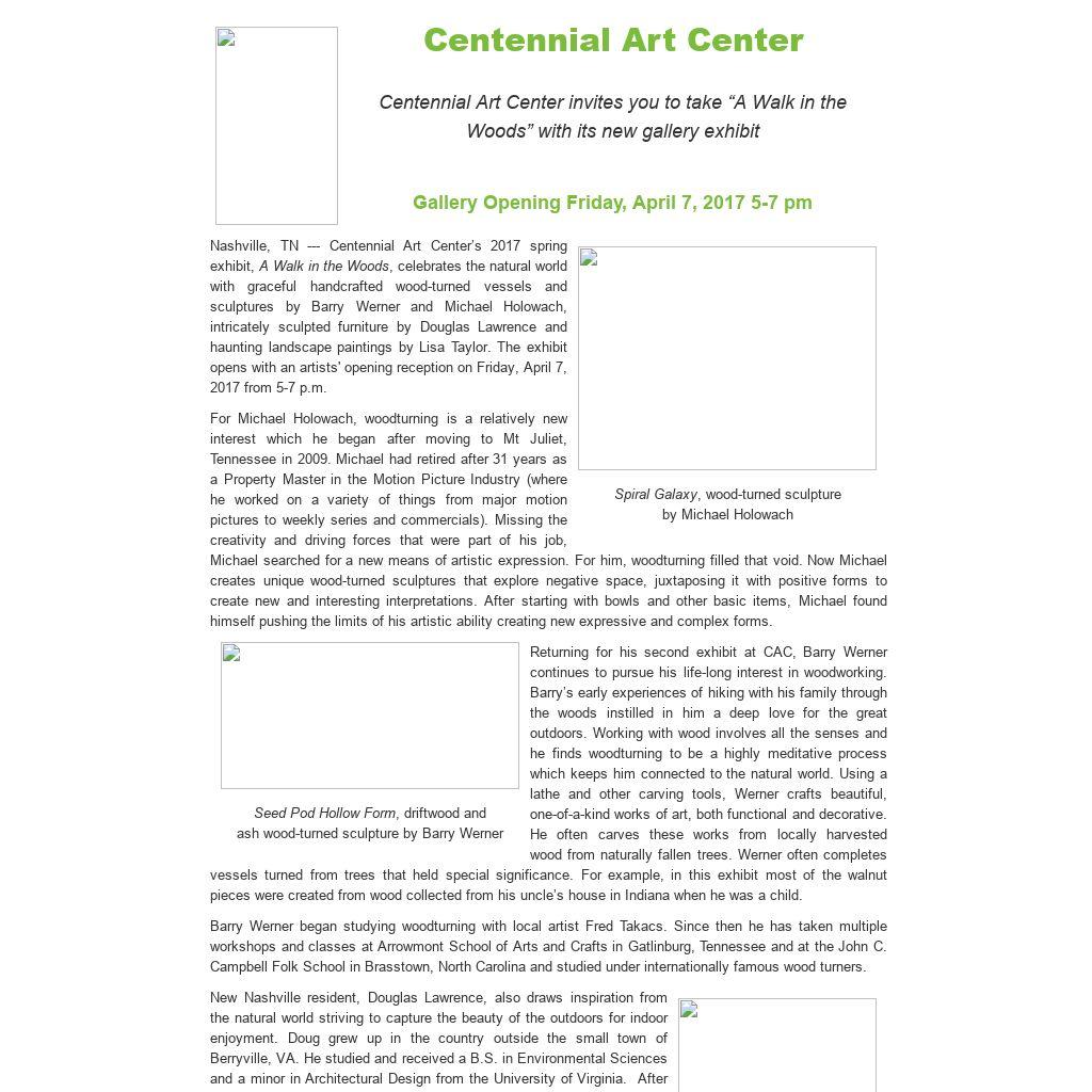 Nashville, TN --- Centennial Art Center’s 2017 spring exhibit, A Walk in the Woods, celebrates the natural world with graceful handcrafted wood-turned vessels and sculptures by Barry Werner and Michael Holowach, intricately sculpted furniture by Douglas Lawrence and haunting landscape paintings by Lisa Taylor. The exhibit opens with an artists' opening reception on Friday, April 7, 2017 from 5-7 p.m.