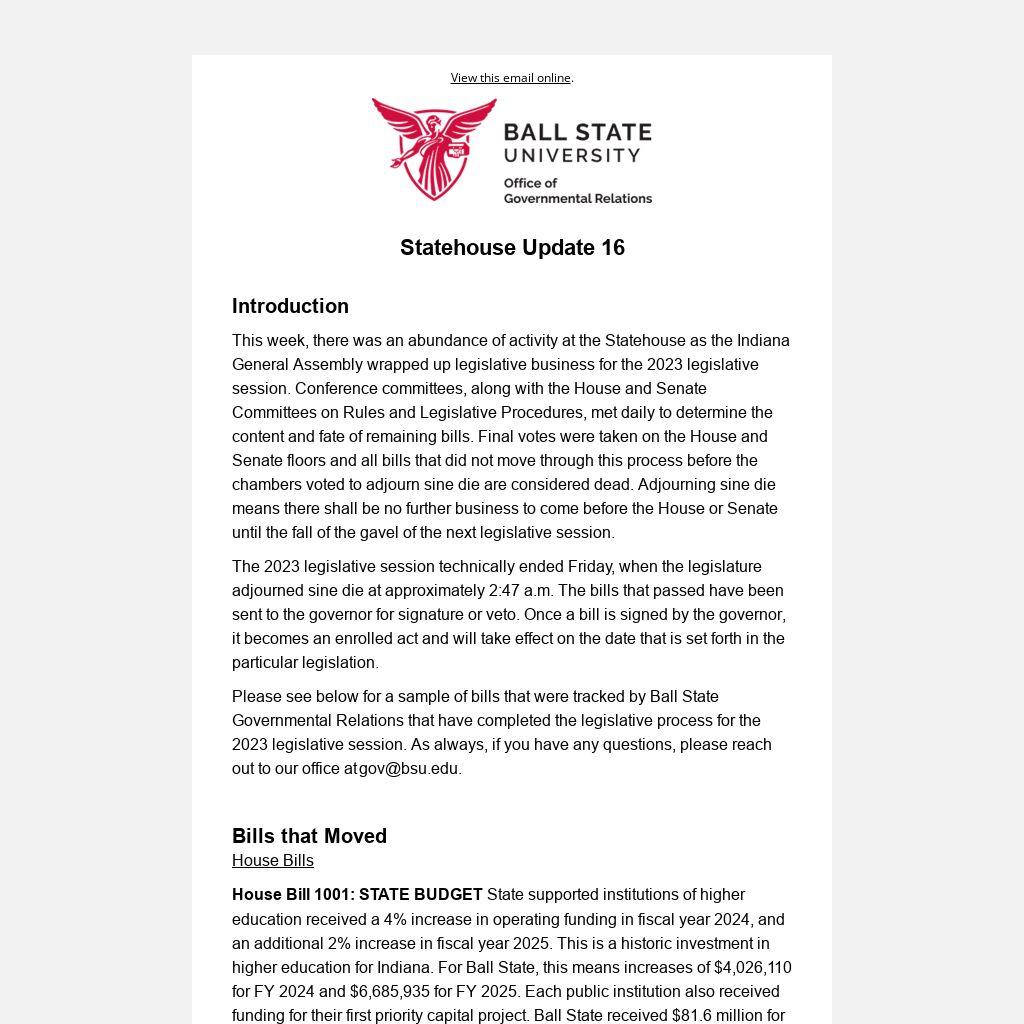 Our office extends our appreciation to you for your time and attention this session. We are grateful to have partners across campus who help us to share our story at the Statehouse and beyond. We look forward to starting our Statehouse Updates once again when the General Assembly will convene for a short session, no later than the fourth Monday in January of 2024.